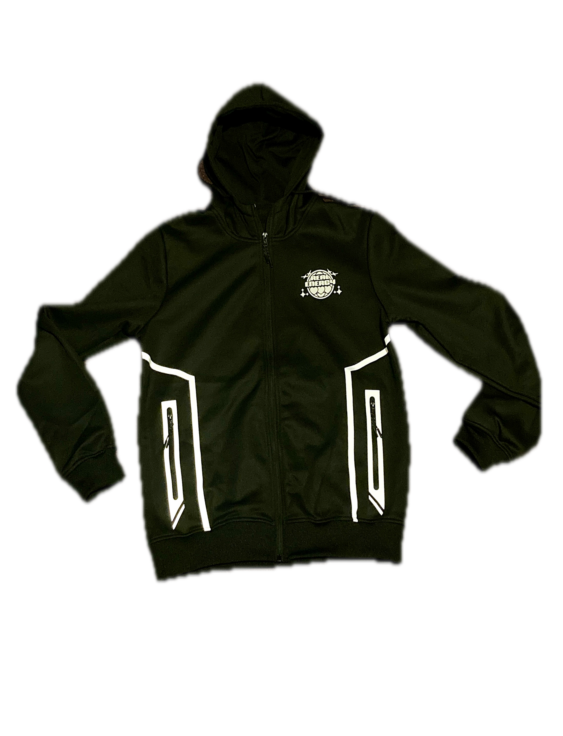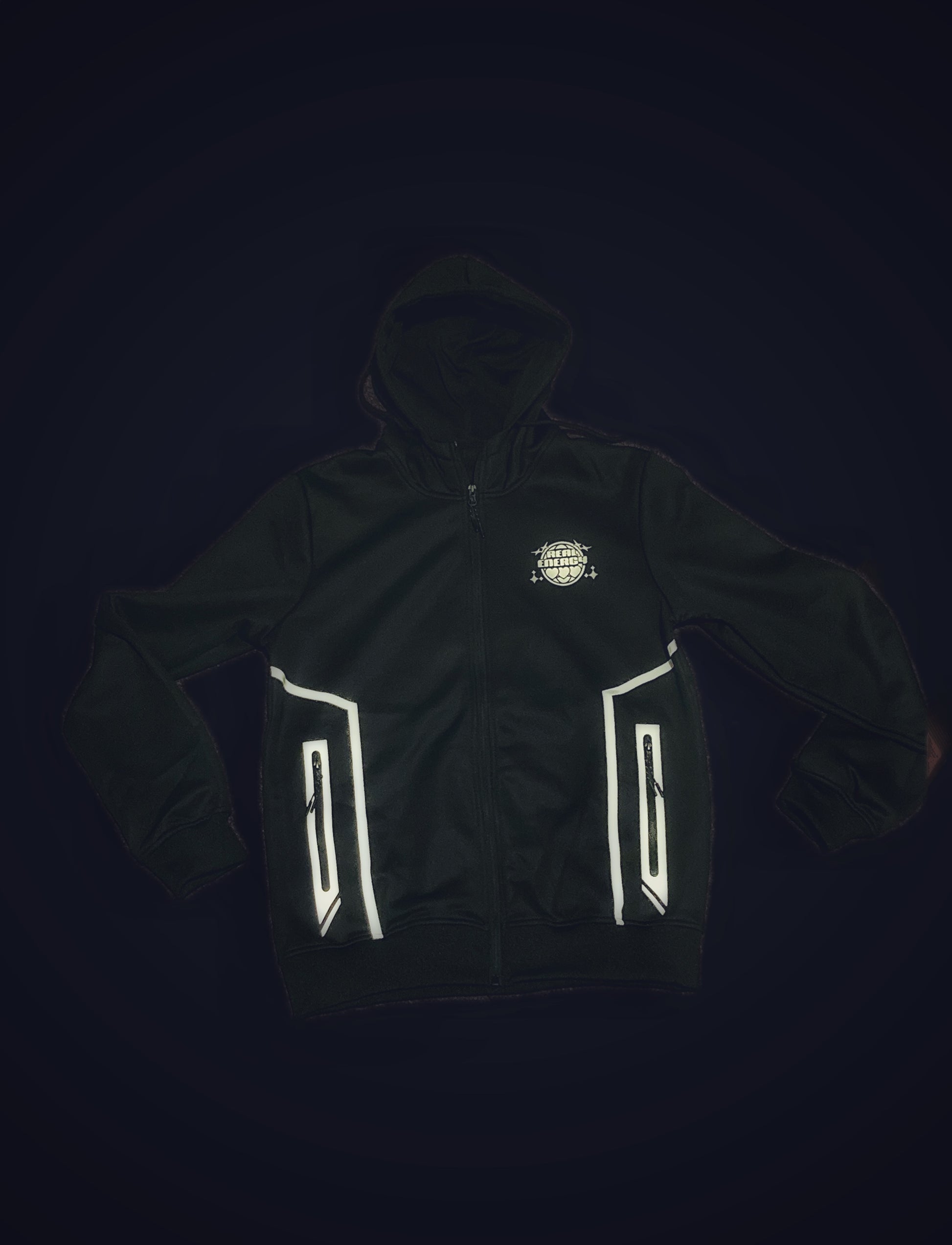 This RNRG Triple Hearts Tracksuit Jacket is designed with a black reflective material and a warm fleece lining. Ideal for outdoor activities, the jacket provides enhanced visibility in low light conditions and added insulation for colder weather. Wash on 40 for easy maintenance.